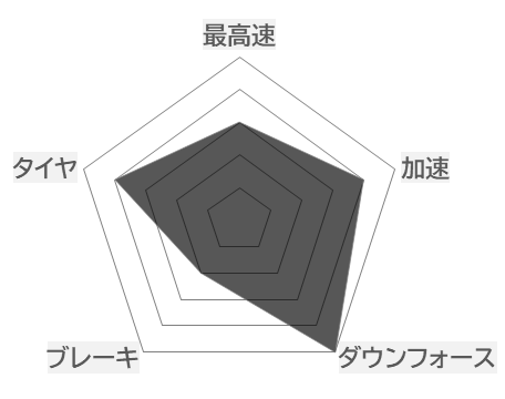 ターン⑭以降のロングストレート「ハンガーストレート」やターン⑤以降の「ウェリントンストレート」などでオーバーテイクは頻発する。高出力のパワーユニットを活かしつつ、ドラッグを最小限に抑えるバランスがポイントで、トップスピードと加速力がオーバーテイクやディフェンスに活躍する。