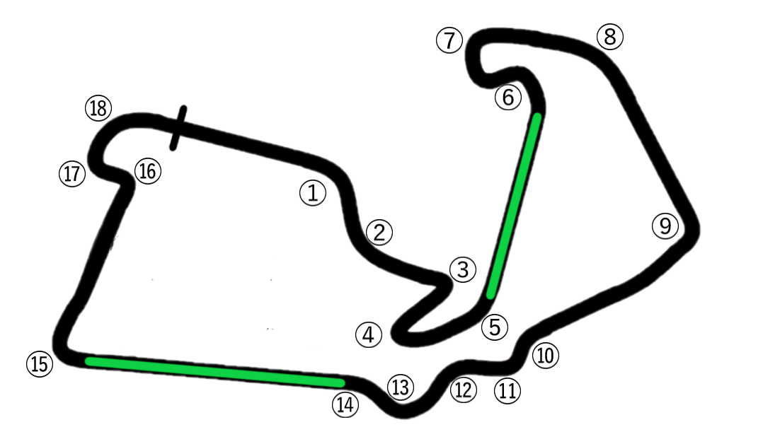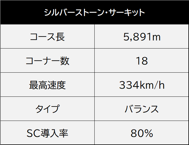 高速コーナーが多く、特にターン⑪からターン⑭までの「マゴッツ」「ベケッツ」「チャペル」の連続セクションは、ドライバーとマシンに極めて高い精度を要求する。一方、ターン①の「アビー」やターン⑱の「クラブ」などのテクニカルな部分もあり、スピードと技術がバランスよく試されるのが特徴。ダウンフォース性能が鍵となる一方、タイヤへの負荷も大きく、戦略が重要になってくる。
