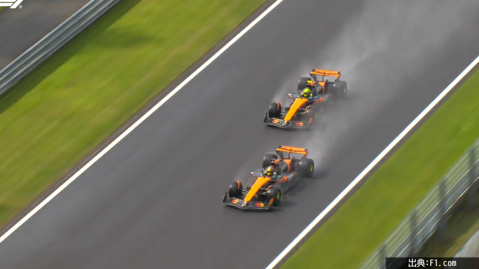 スタート直後、フロントロウからスタートしたマクラーレン勢のうち、ピアストリがケメルストレートでノリスを交わしてトップに浮上。その後は路面の乾き具合に応じてタイヤ戦略が焦点となり、10周過ぎにはフェラーリのルイス・ハミルトンがいち早くスリックタイヤに変更。その動きに後続も続き、12〜13周目には上位勢も続々とスリックへ切り替え、順位が大きく変動した。