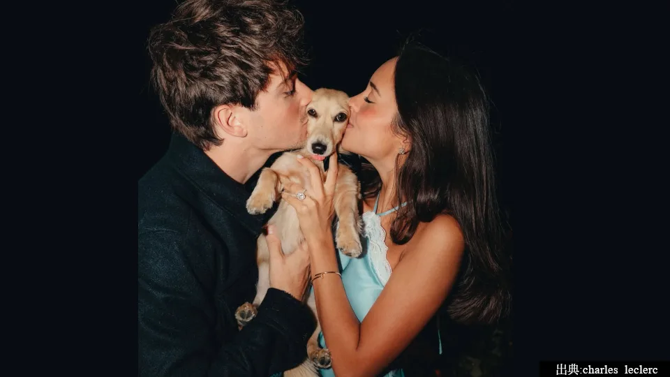 ルクレールは愛犬レオを抱いた2ショット写真を投稿し、「Leclerc夫妻(Mr. & Mrs Leclerc)」というキャプションに指輪とハートの絵文字を添えた。