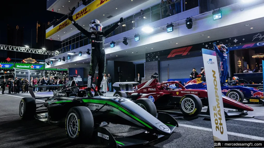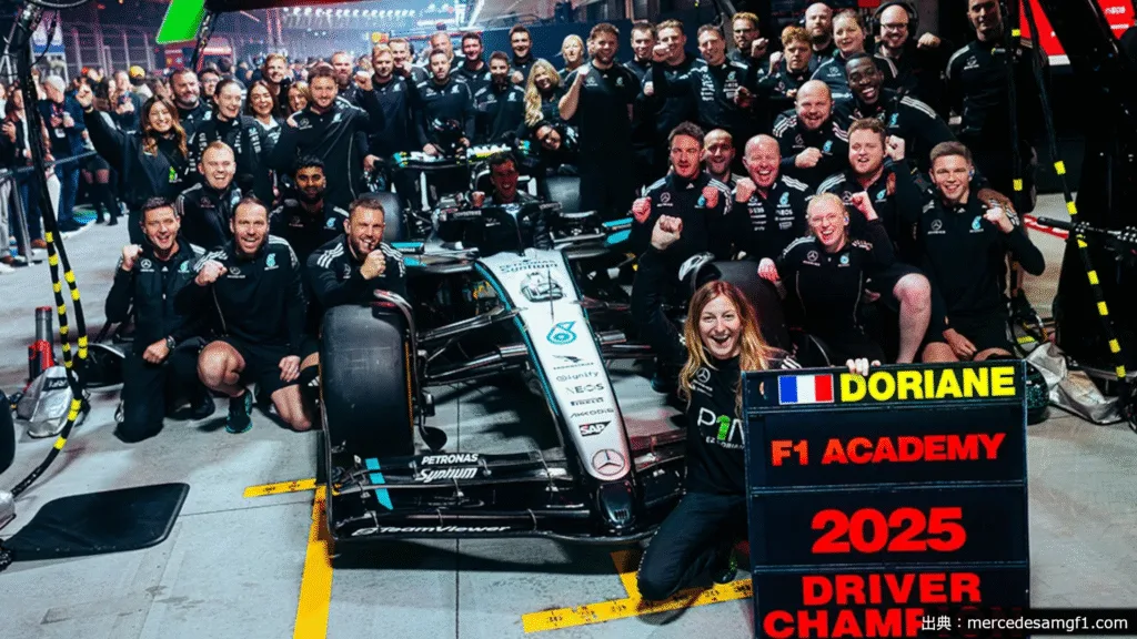 2025年11月23日、ラスベガスで開催された F1 アカデミー シリーズ最終戦において、メルセデス・ジュニアドライバーの ドリアン・ピン がドライバーズチャンピオンシップを制しました。これにより、彼女は同シリーズの歴代3人目のチャンピオンとなります。